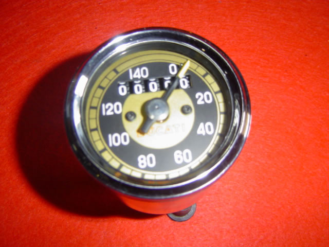 Cuenta kilómetros ducati, de 60 diámetro, fondo dorado.140 km hora.